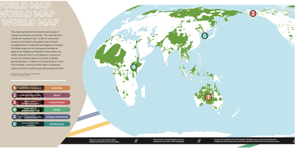 Along with the IU Arts and Humanities Indigenous Futures Initiative, this exhibition was made possible with the help of the IU Office of the Vice-President for Humanities, Authors of the Local Biodiversity Outlook and the Forest Peoples Programme, Intergovernmental Panel on Biodiversity and Ecosystem Services, Authors of the ‘global land map of Indigenous lands’ Garnett et al. 2018, Authors of the article “Locally based, regionally manifested, globally relevant: Indigenous and local knowledge, values, and practices for nature” Brondizio et al. 2021, and Theresa Quill, IU Map and Spatial Data Librarian.