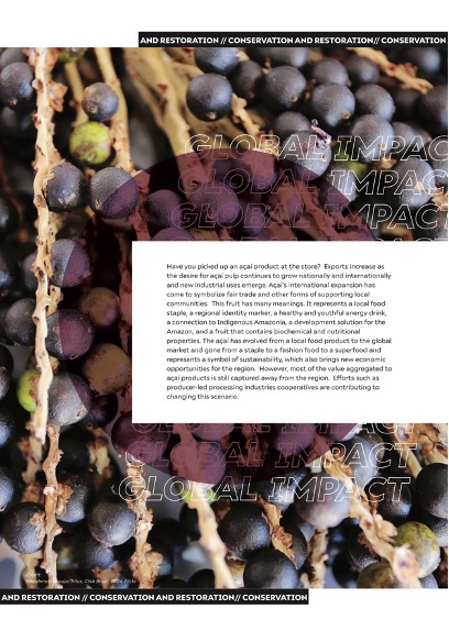 In the “Conservation and Restoration” pathway, the exhibition explores the local and global impacts of the acai berry, specifically how the people of the Amazonian floodplanes have managed the acai palm since the eighteenth century. Their innovations in forest and agroforestry management techniques allowed them to keep up with exponentially growing demand. Today, acai fruit production is not only profitable for the area, but also allows communities to transform unproductive and degraded lands into biodiversity-rich agroforestry. Globally, not only are acai fruits more readily available in stores for customers to enjoy, but the techniques employed by Amazonian peoples to rehabilitate previously untenable land are lessons to heed as environmental disaster threatens many of our coastlines.